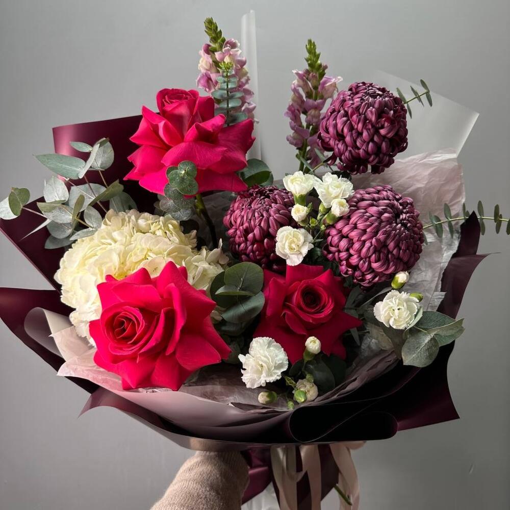 Авторский букет с хризантемой бигуди в Аксае